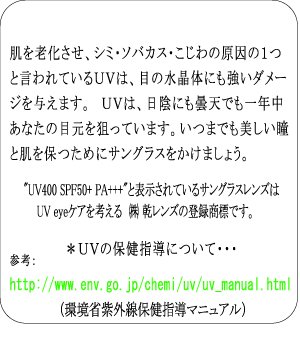 [UV400」は、眼鏡業界でいう紫外線カットレンズの意味を表しますが、
